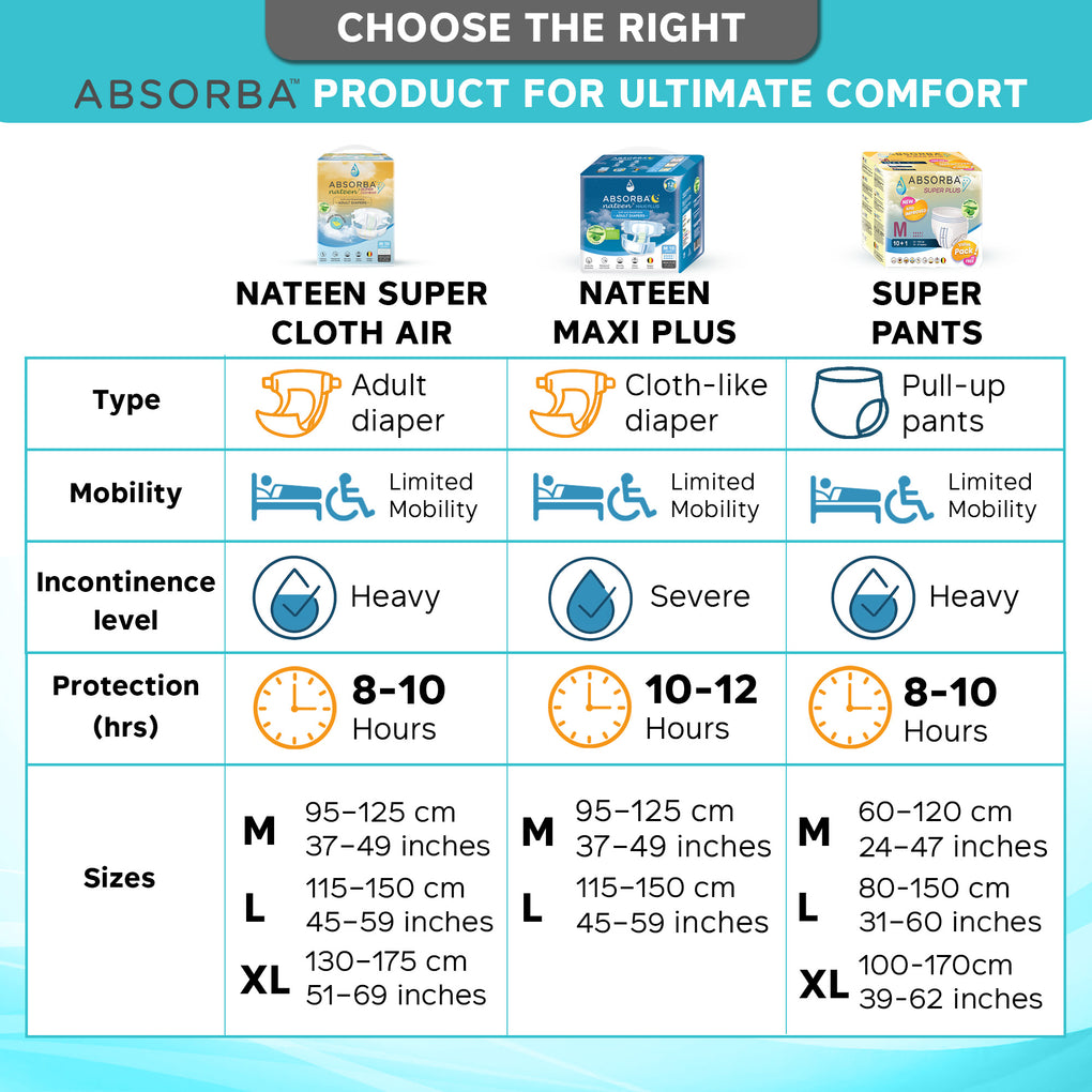 ABSORBA Nateen PLUS Adult Diapers are designed for bedridden, semi-mobile, or heavy incontinence users, providing long-lasting dryness and skin-friendly comfort. Soft, breathable materials ensure skin health, while secure refastenable tape tabs and odour control give confidence for day and night use.
