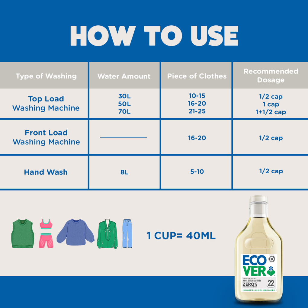 Suitable for all delicate textiles, including wool and silk. Don’t pour directly onto your laundry. Always follow label and machine instructions. Suitable for cold washes and 30-40°C. Flame-retardant finishes: never soak or wash above 50°C.