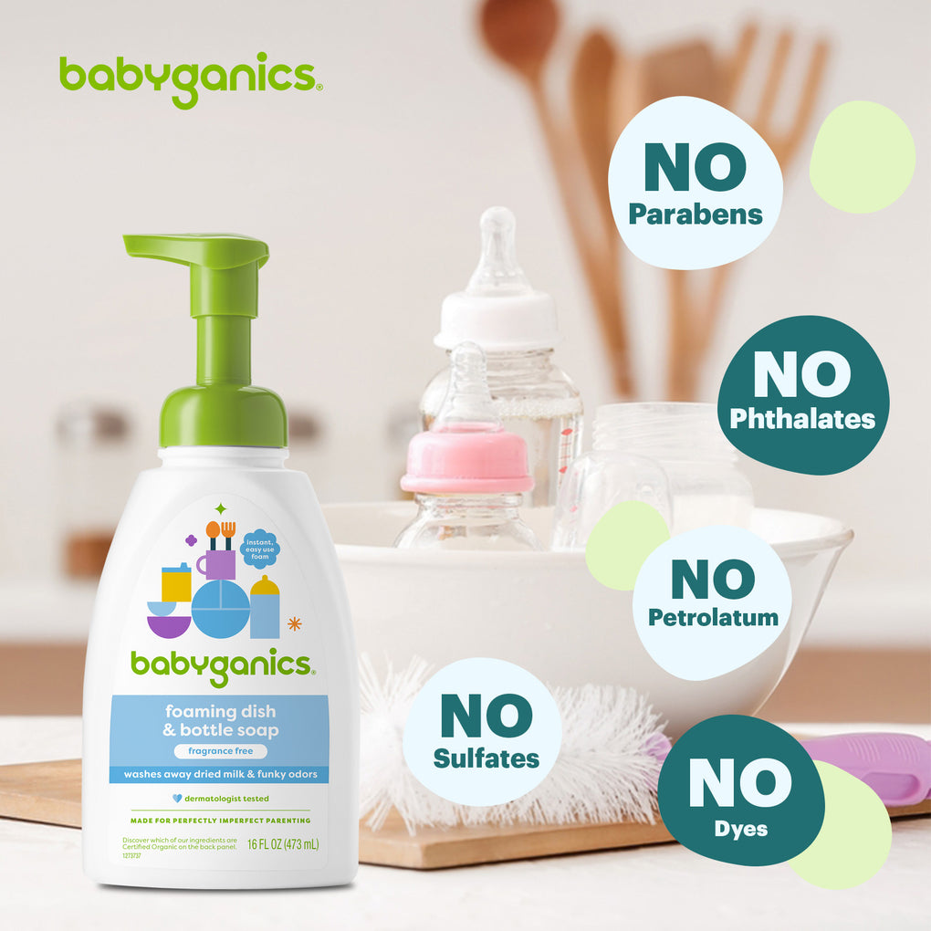 One tiny baby = one full sink of dishes and bottles. Make those sippy cups, bottles and breast pump accessories squeaky clean, and quickly. Our foaming dish soap, made with plant-derived and other thoughtful ingredients, does away with grease and dried-on goo, then rinses clean. Whether it’s for baby, family or dinner party dishes (remember dinner parties?), our foamy super soap saves the day.