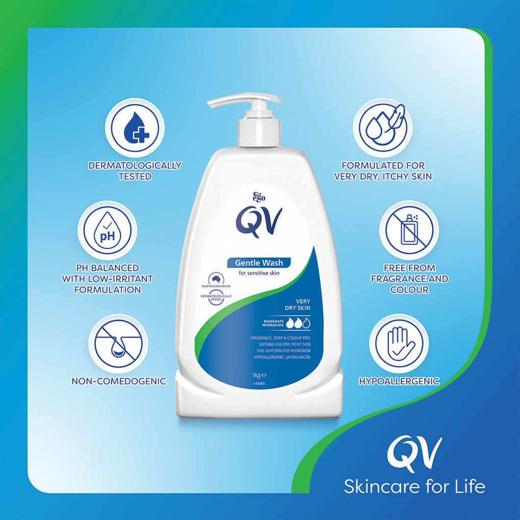 QV Gentle Wash is designed for dry or sensitive skin. It works to help maintain hydration during cleansing so skin is left clean and feeling soft. QV Gentle Wash is also non-comedogenic so it won’t block pores. It is a pH balanced, low-irritant formulation, free from fragrance, colour, lanolin and propylene glycol.