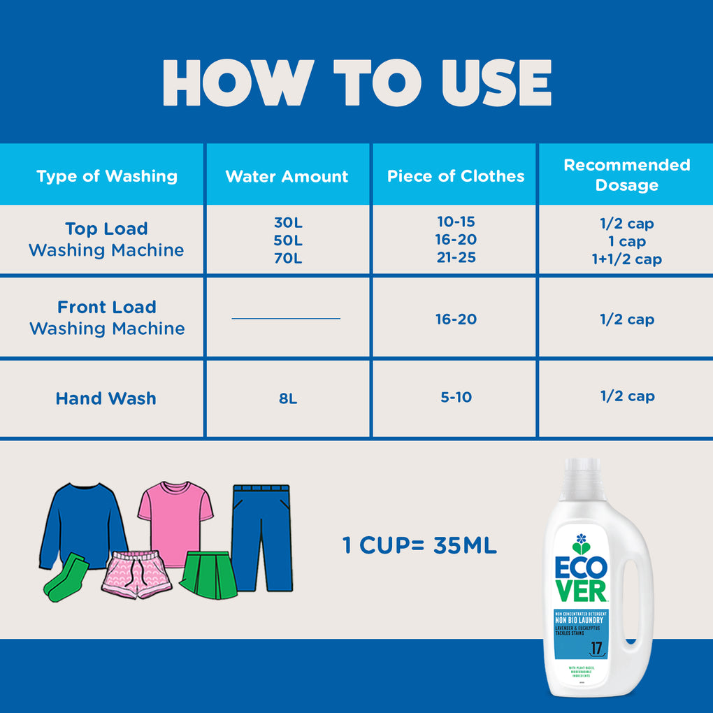 Hand Wash: Just dissolve 1.5 cap (53ml) in 5 litres of warm water. Wash and rinse your clothes as normal. Wear gloves when hand washing to avoid direct skin contact.