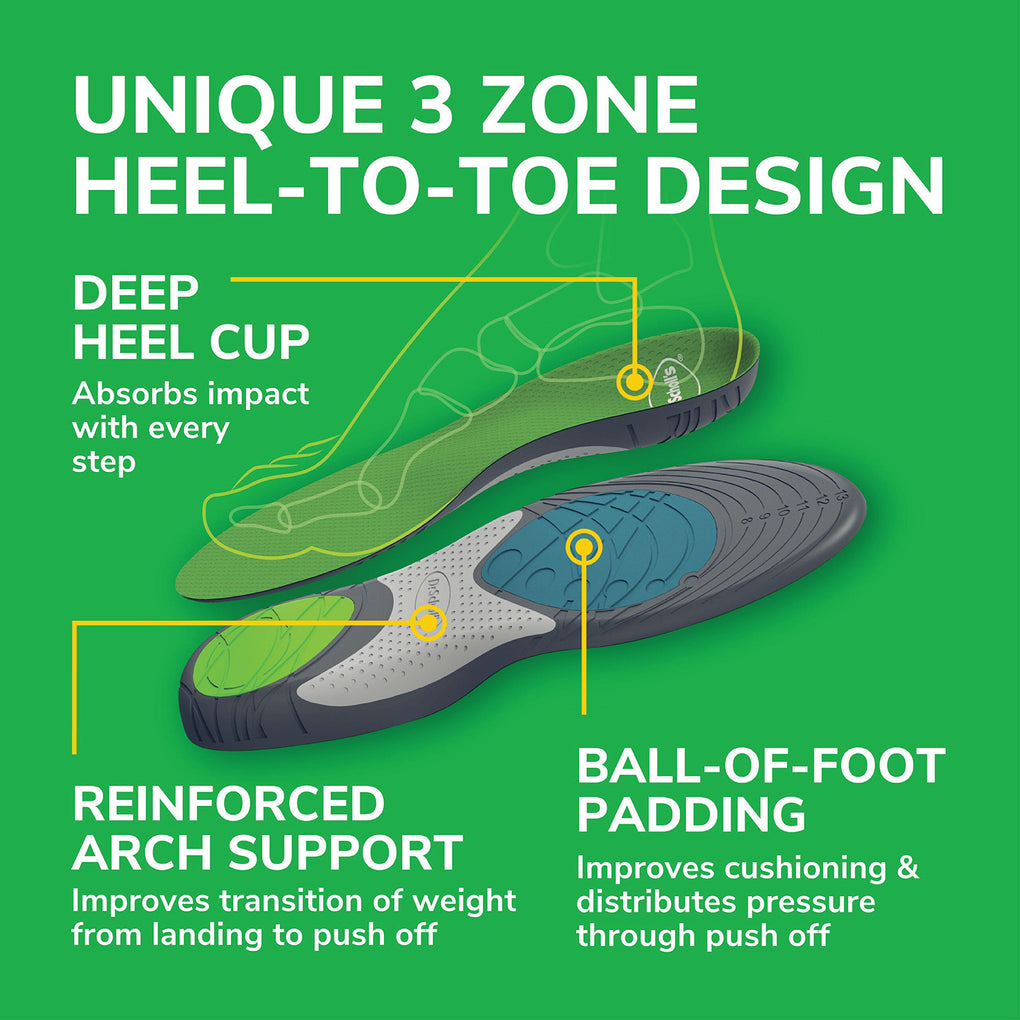 Dr. Scholl's® Run Active Comfort Insoles are specifically designed for runners to help relieve and prevent pain from runner’s knee, shin splints, and plantar fasciitis. These insoles provide support, added cushioning, and shock absorption so that you can stay active and on your feet for longer!