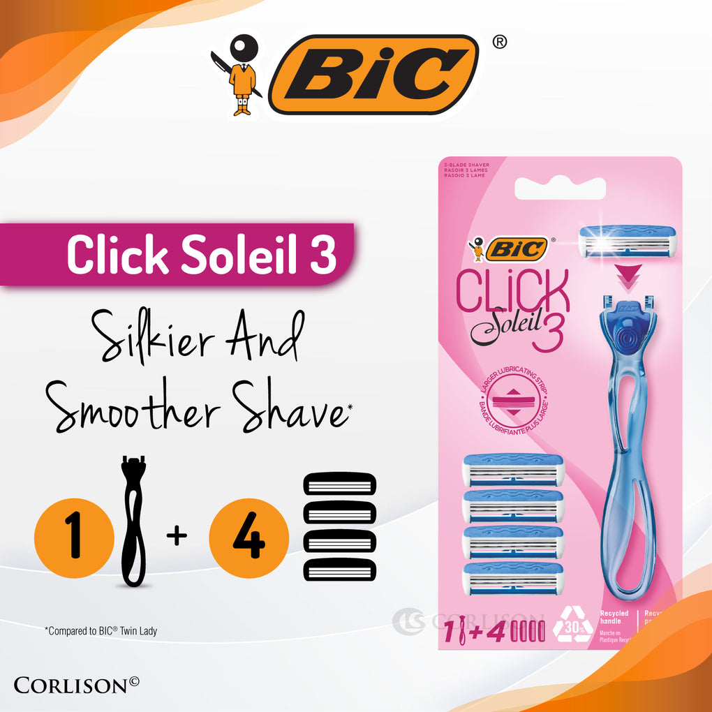 BIC Click 3 Soleil women’s shaver kit with 1 handle made of 30% recycled plastic and 4 blade cartridges in recyclable packaging. An all-in-one triple-blade shaver for a flawlessly smooth shave with a pivoting head for added control. Easy-click replacement cartridges have a soothing moisture strip infused with cocoa butter. Curved blue handle designed for controlled handling, even when wet.