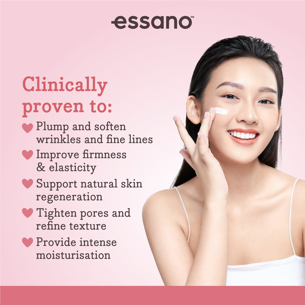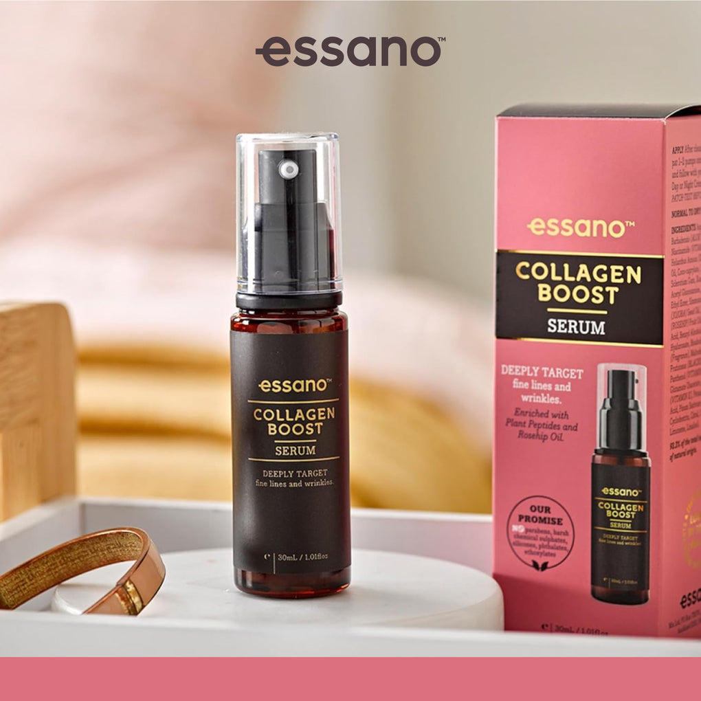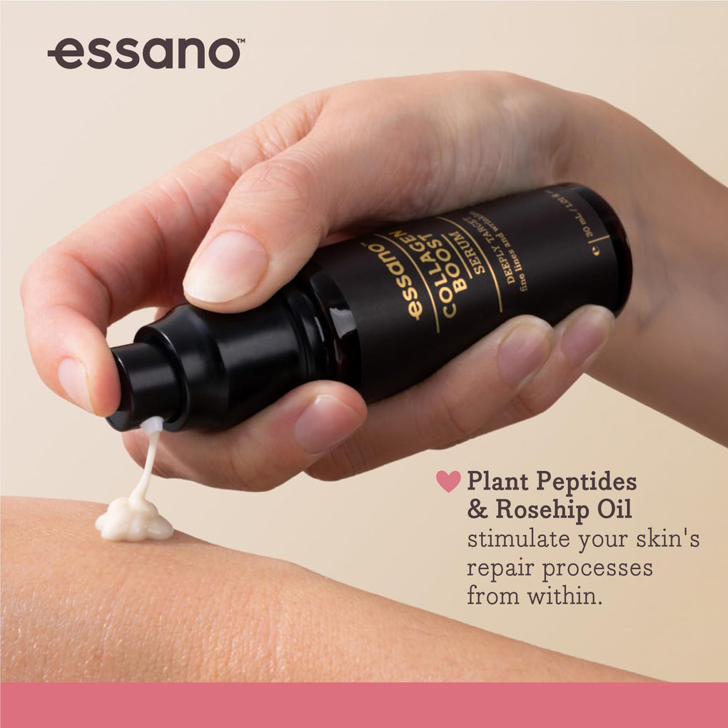 essano Collagen Boost Serum contains Plant Peptides and Rosehip Oil to stimulate your skin's repair processes from within.