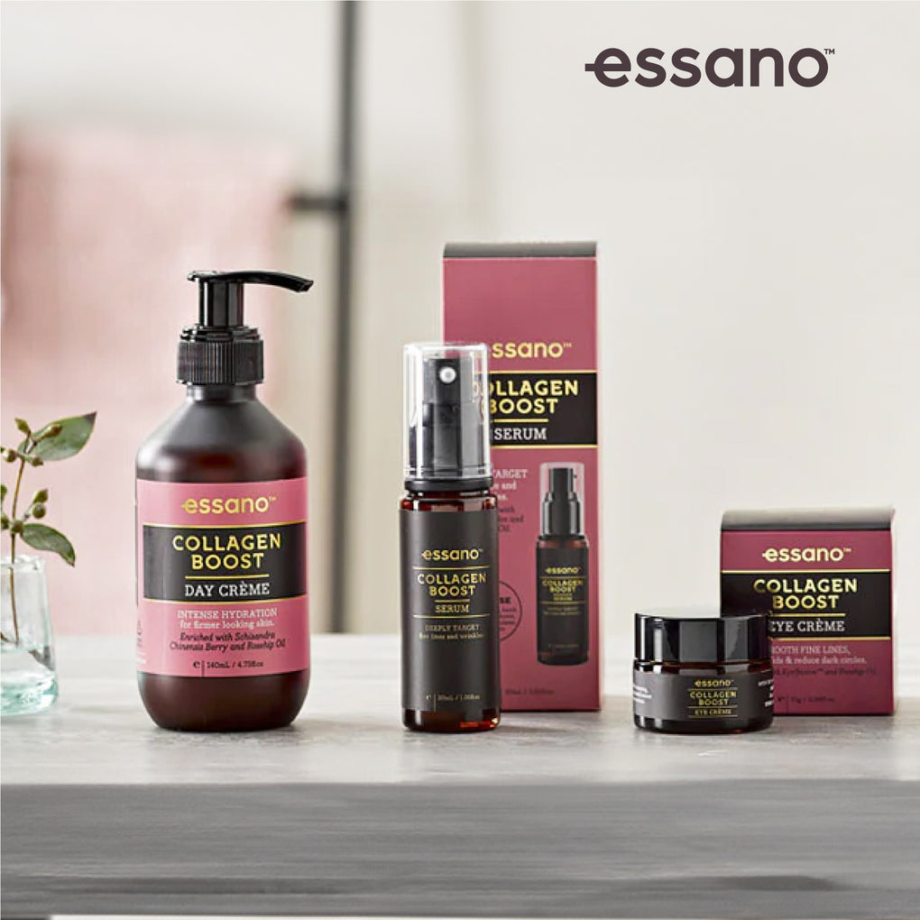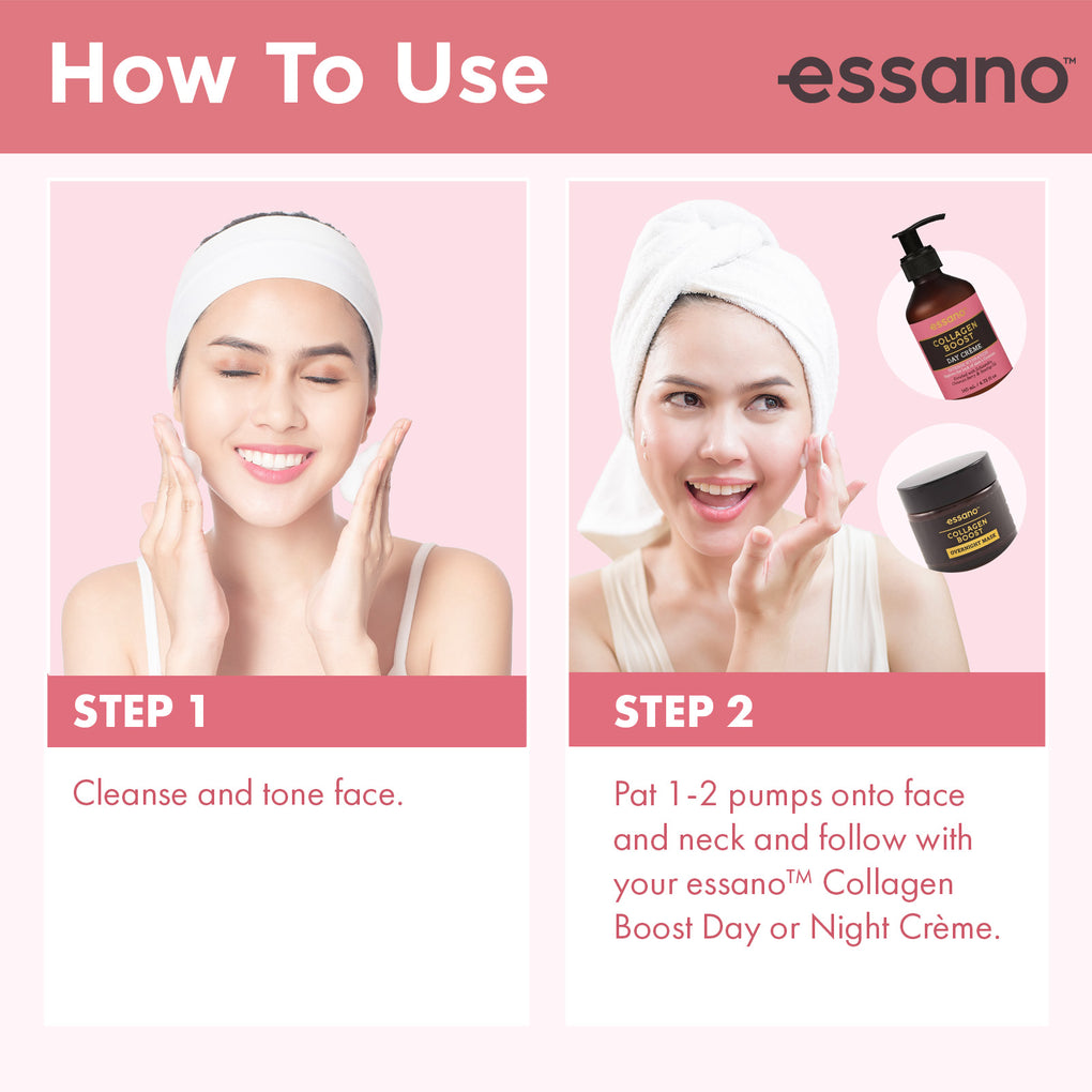 After cleansing and toning, pat 1-2 pumps onto face and neck and follow with your essano Collagen Boost Day or Night Crème.