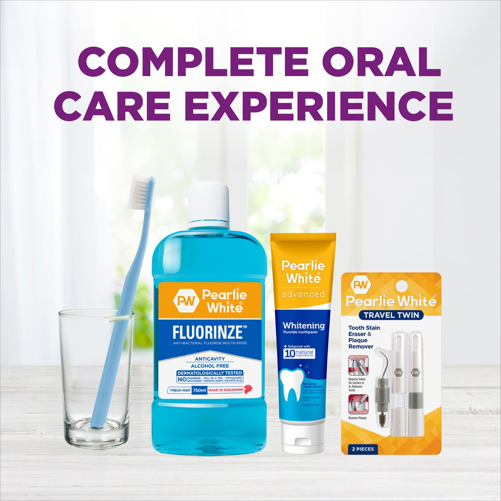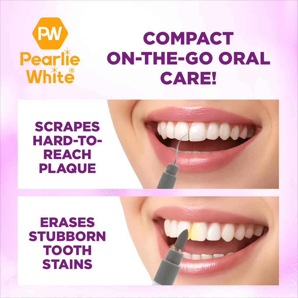 Going where brushing and flossing cannot, our Travel Twin Tooth Stain Eraser & Plaque Remover is a unique dual purpose oral health kit that’s exclusive to Pearlie White.