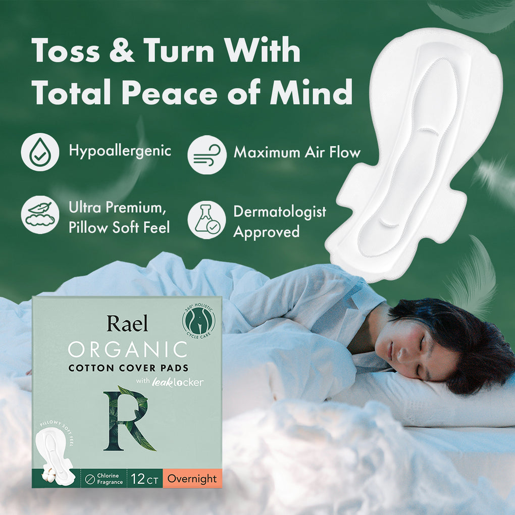 Made without any harmful chemicals, Rael Organic Cotton Overnight Pads are designed for ultimate all-night leak protection.