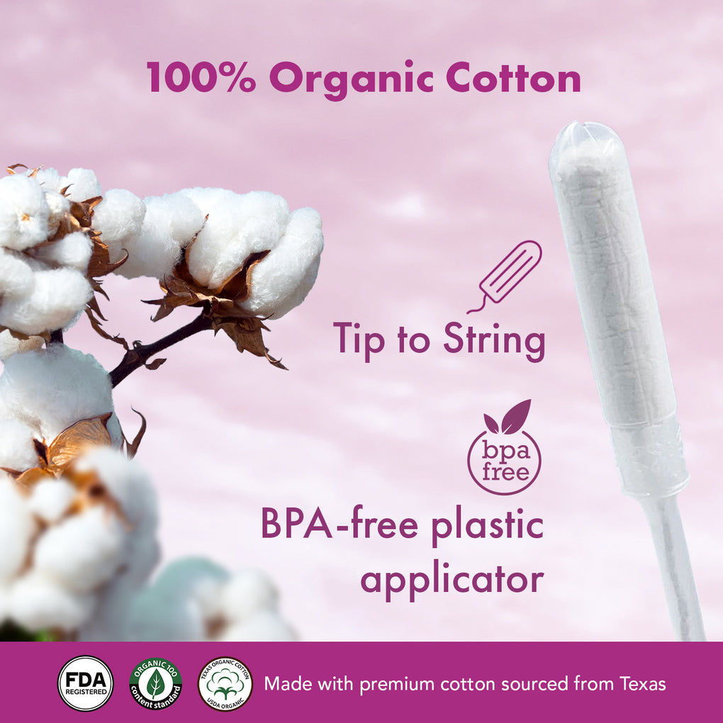 Making your heavy days feel light and your light days feel even lighter, our tampons are scientifically formulated with certified organic cotton and housed in a slim BPA-free applicator for peak performance and comfort.