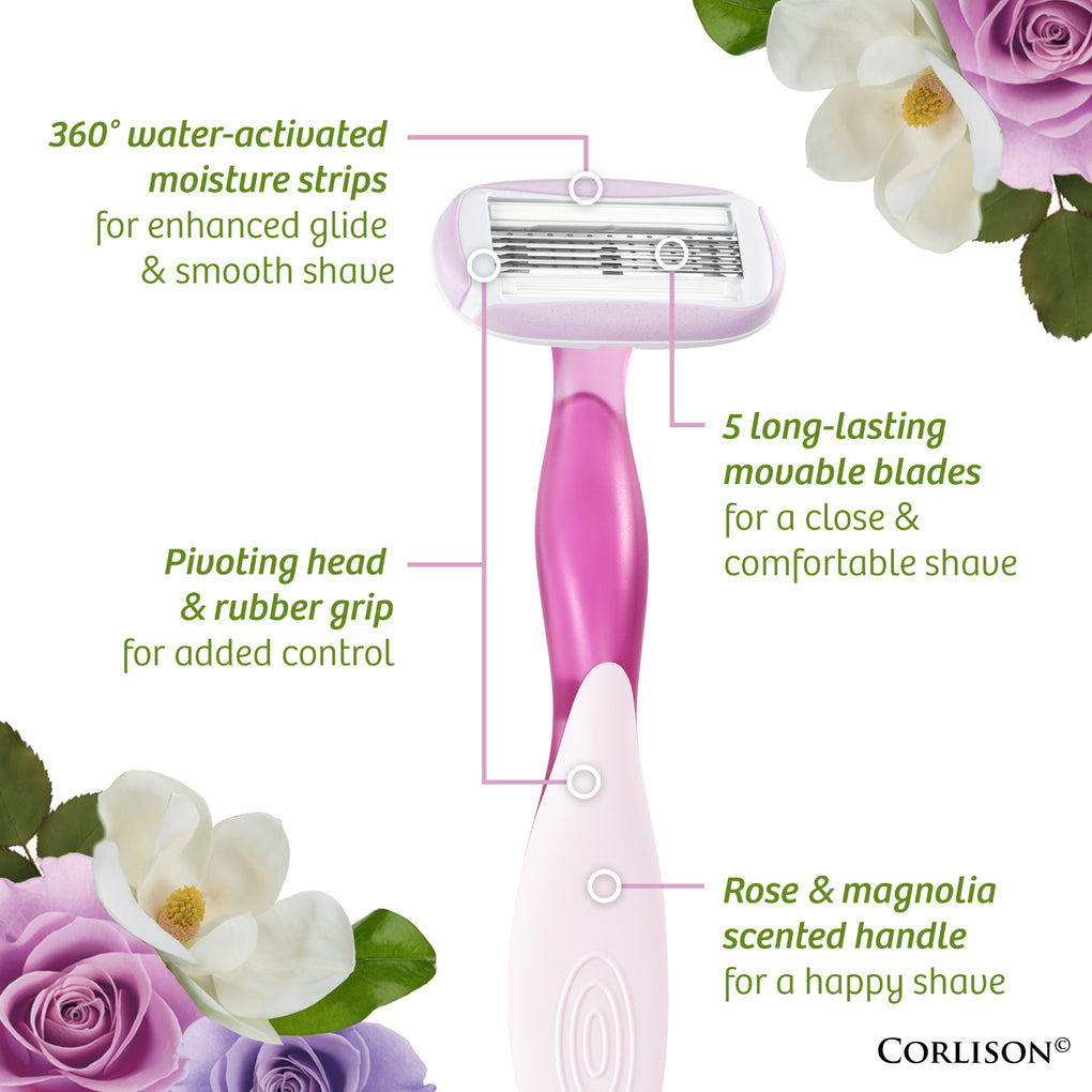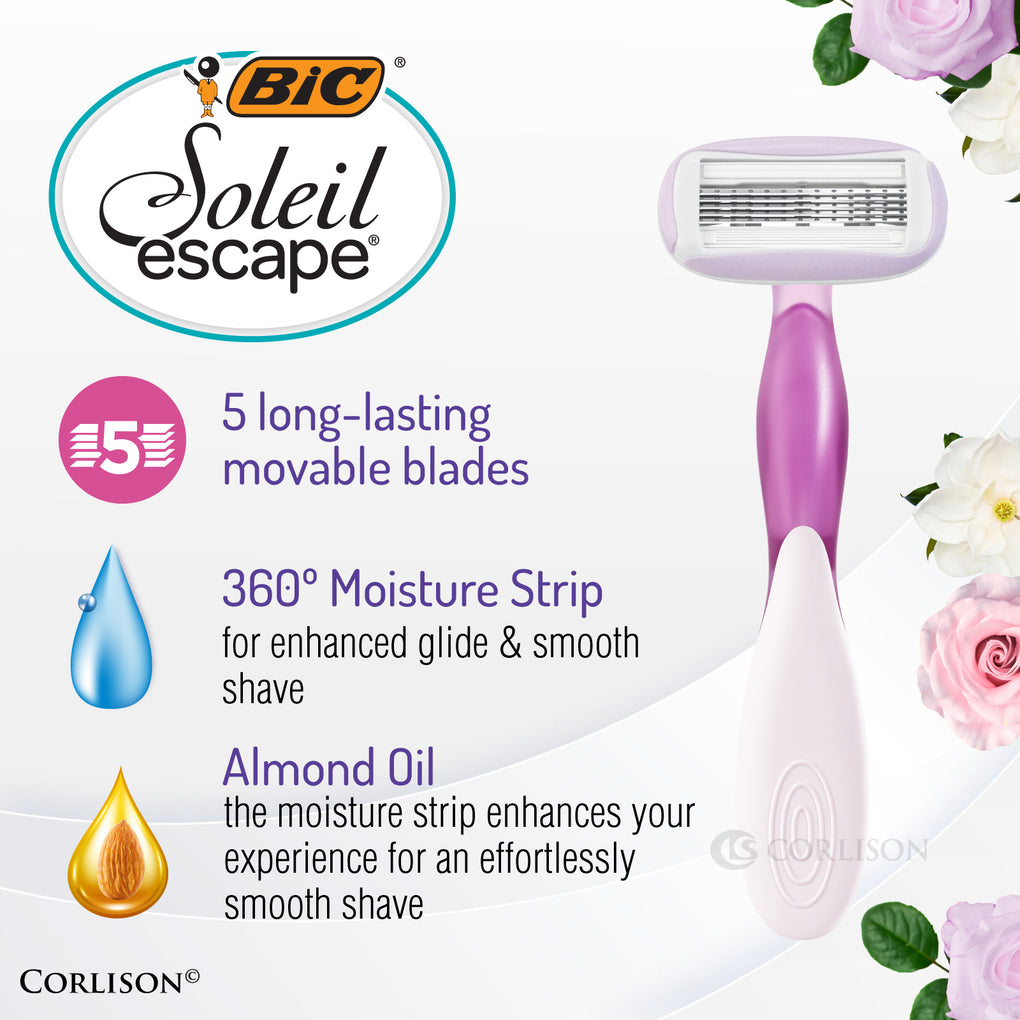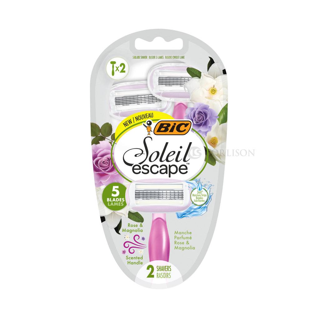 The BIC Soleil Escape Rose & Magnolia 5-Blade women’s razor creates a smooth, clean shave while you enjoy the scented handle. In addition to 5 durable moveable blades, it also boasts a rubber grip for full control, and a pivoting head that hugs all your curves. The 360° water-activated moisture strips are enriched with almond oil to improve glide for a nice smooth shave. Enjoy safe handling with the curved handle that's scented with rose and magnolia. Make shaving a pleasant experience.