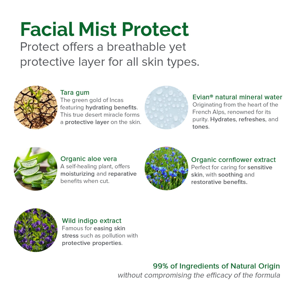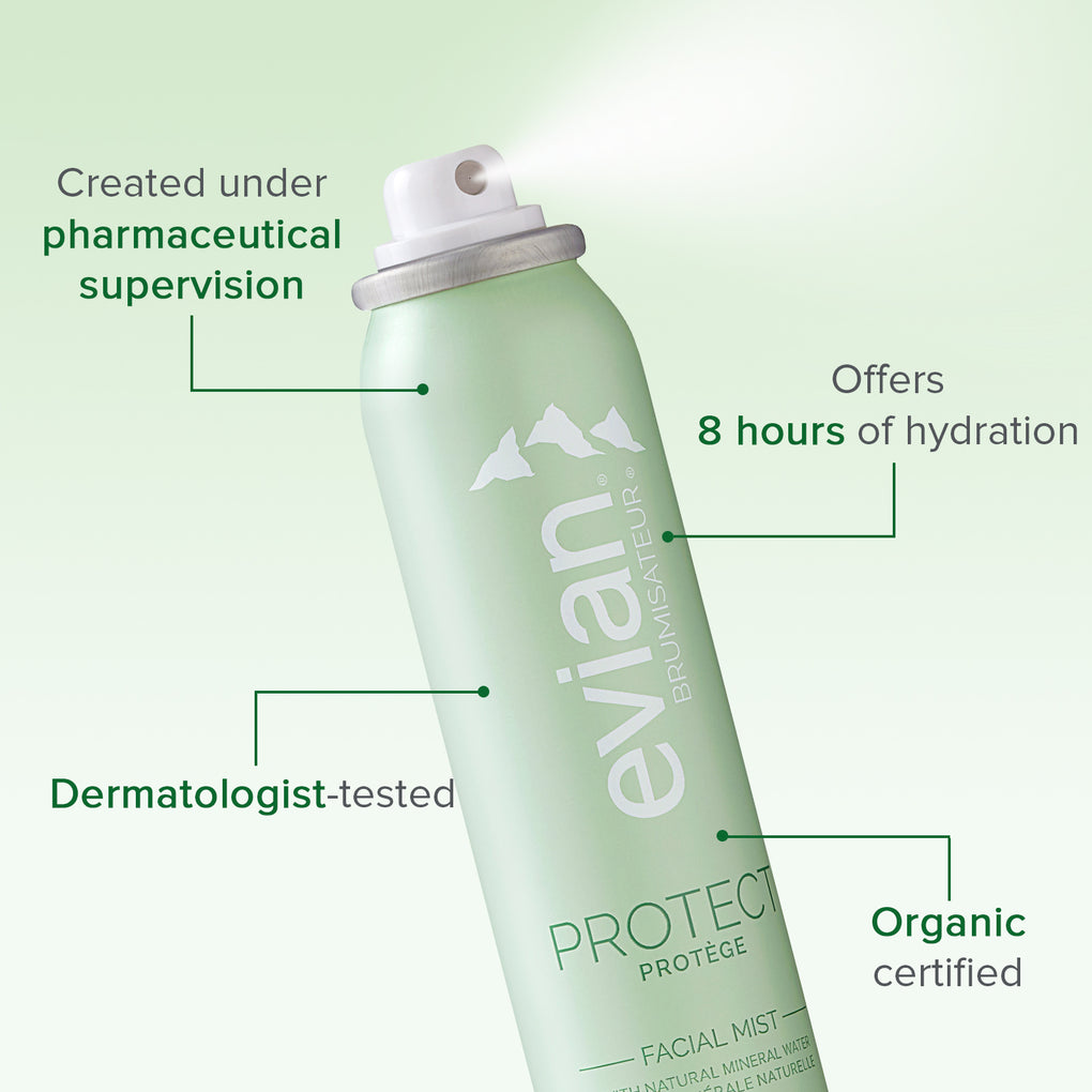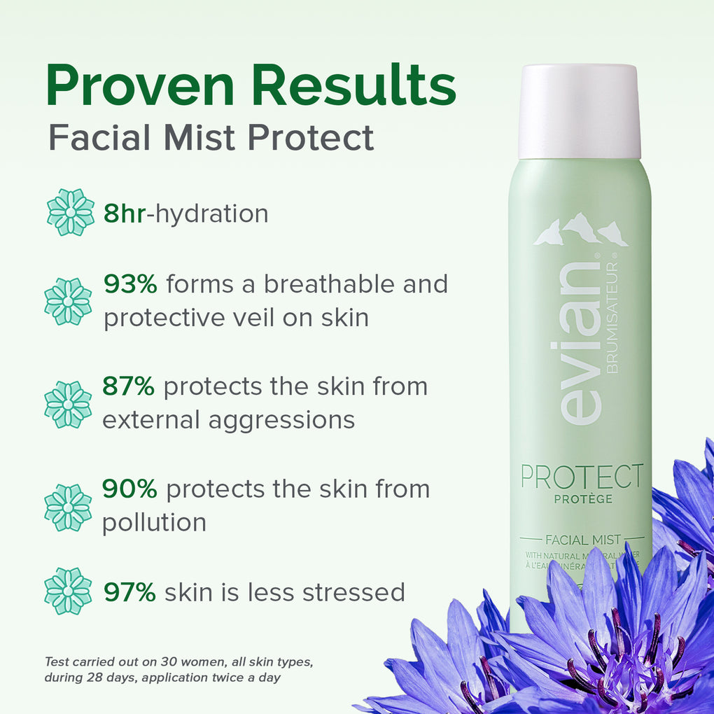 • evian® Facial Mist Protect is formulated with evian® natural mineral water and wild indigo extract.