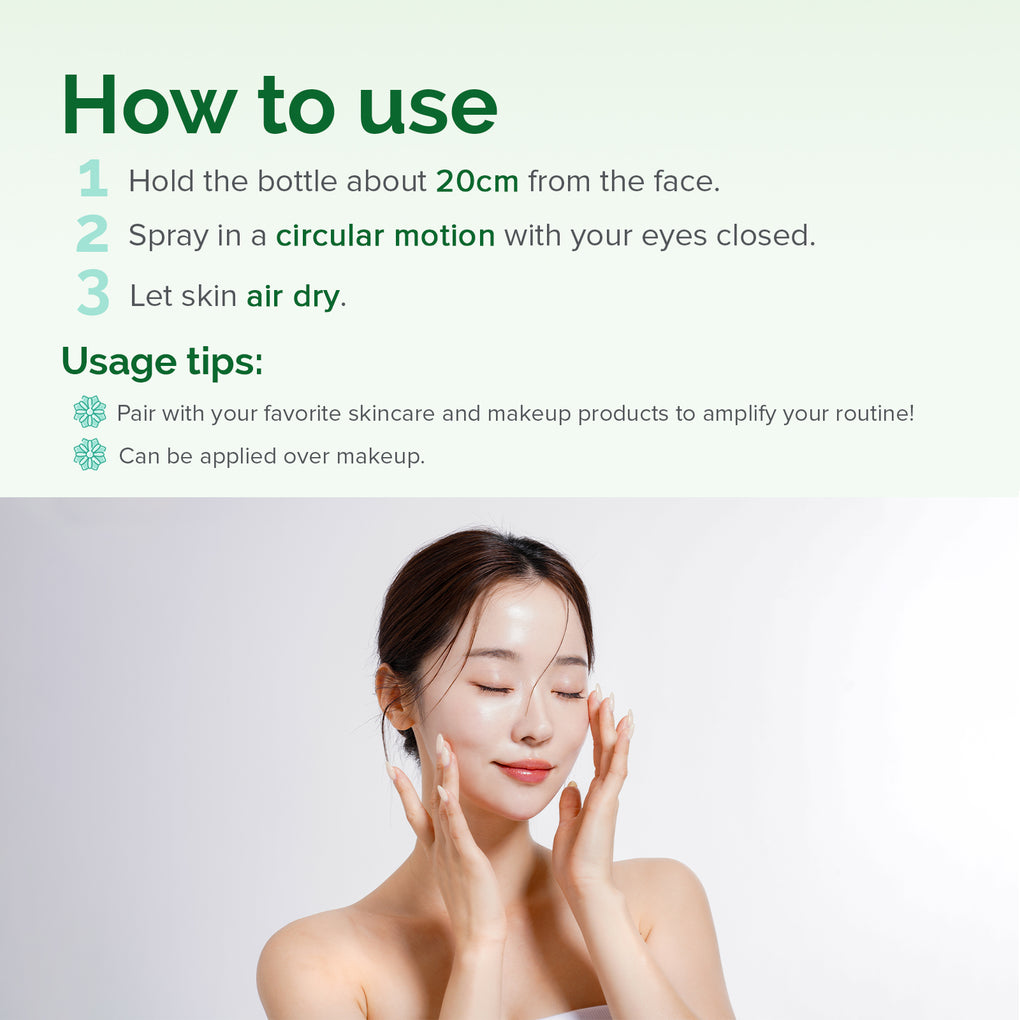 • Hold the bottle about 20cm from the face, spray in a circular motion with the eyes closed. Allow skin to air dry.