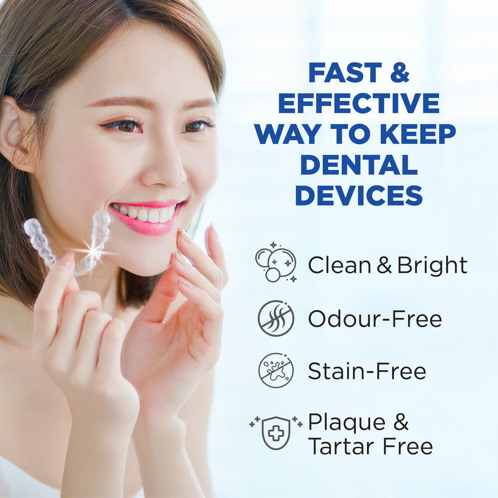These tablets are effective and gentle on most removable dental appliances. It can be used daily to deeply cleanse dental appliances in 3 minutes, killing 99.99% of odour causing bacteria and effectively removing stains, discoloration, plaque and tartar.