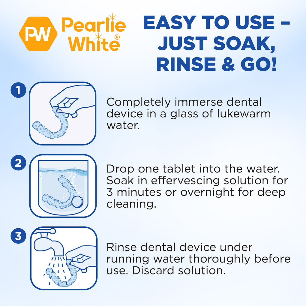 Dental professionals recommend cleaning these dental devices with safe and effective daily cleansing solutions such as the Pearlie White Retainer Clean™ Fast Cleaning Tablets 42s, which is scientifically formulated for Aligners, Clear & Wired Retainers, Gum Shields, Removable Braces and Sports/Mouth/Night Guards.